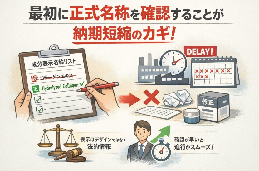例えば、PCPC INCI検索で正式名称を確認せずに進めた場合、印刷直前で差し替えになるケースがあります。これはデザイン修正ではなく「法的修正」です。そのため審査側の視点で先に整えることが納期短縮の前提になります。