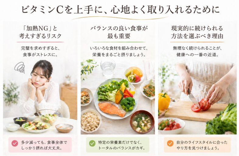 ビタミンCは「生が最適」と決めつけるより、摂取量と継続性を重視する方が合理的です。食べやすさと栄養の両立で、日常的に取り入れやすい形を作ることが重要です。